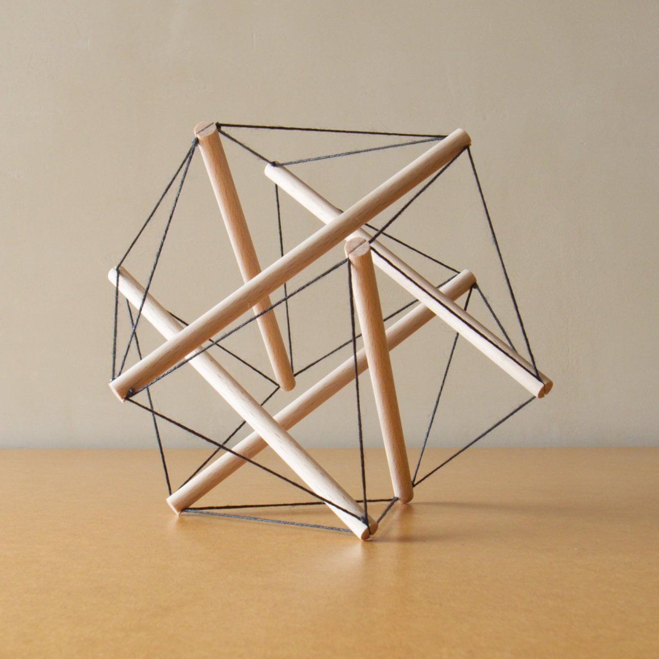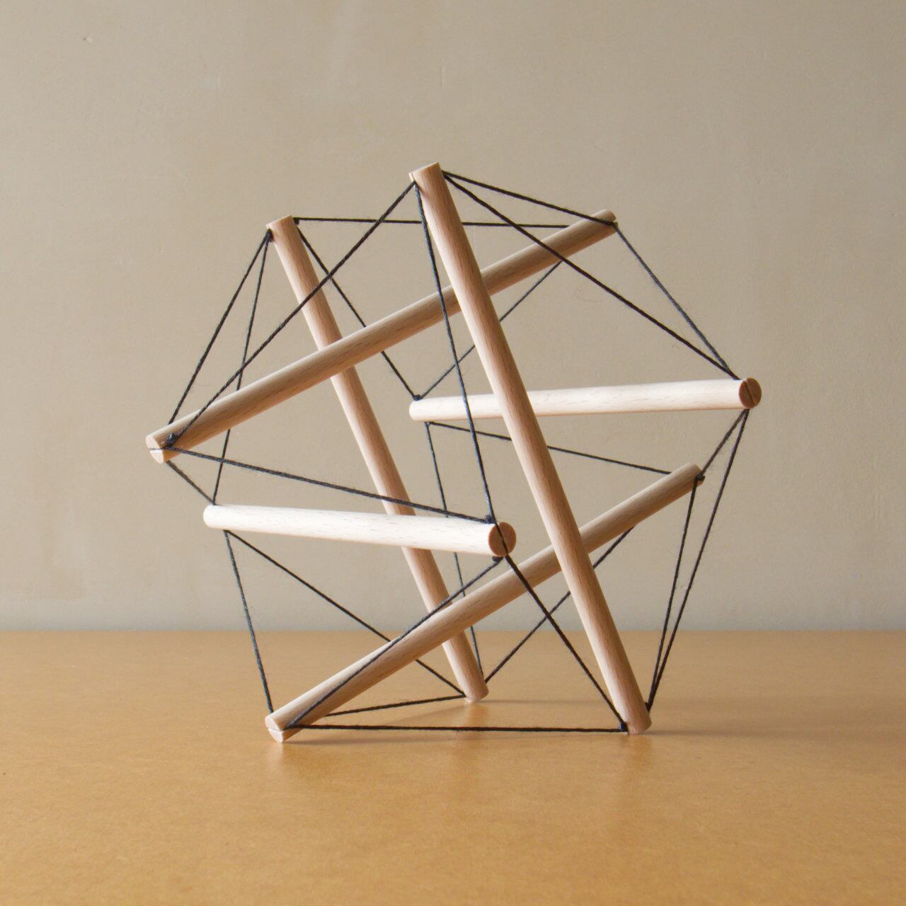 輪にした麻糸を丸棒の両端にはめ込んだものを6本、順番に組み立てていきます。最後の1本をはめた瞬間、すべての糸がピンと張って形が安定します。この瞬間がなかなか気持ちいいです。付属の説明書をよく読んで組み立ててください。